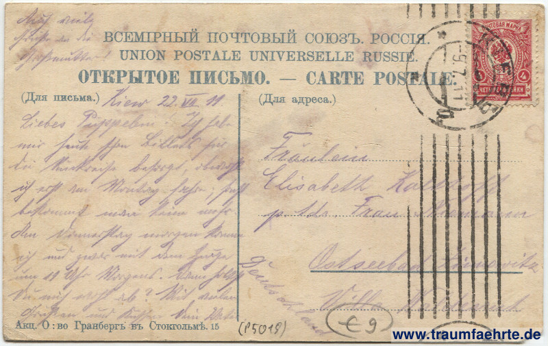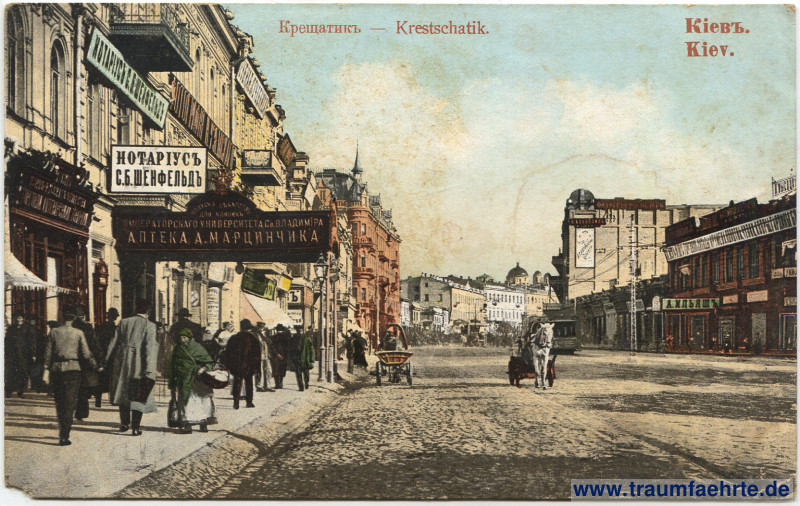 – Details – Jahr: ca. 1910 Status: gelaufen 1911 Beschriftung vorne: Киевъ. Kiev. Крещатикь – Krestschatik. Beschriftung hinten: Всемірный почтовый союзъ. Россия. Union postale universelle Russie. Открытое письмо. – Carte postale. (Для письма.) (Для адреса.), Акц. О:во Гранбергъ въ Стокгольмѣ. 15 Stempel: Киевъ, * * […], -9.7.11; ––– Hinweis:
