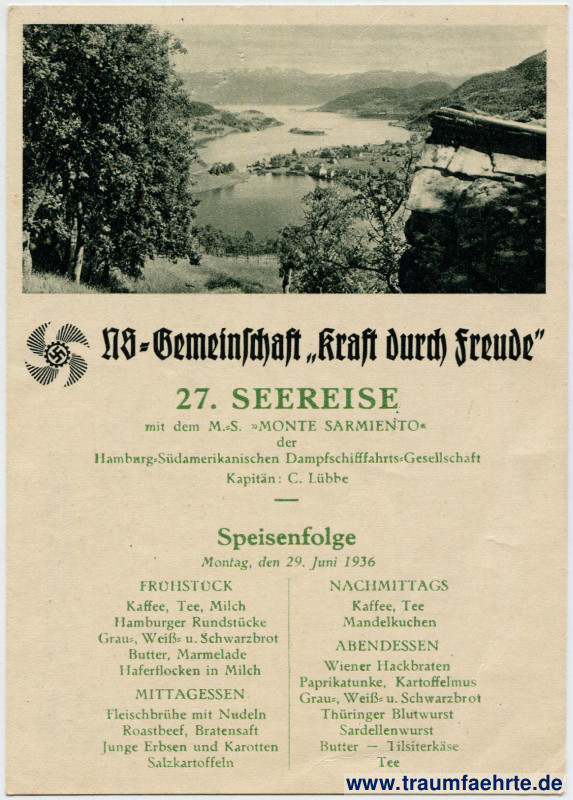 ACHTUNG: Wichtiger Hinweis zu Werken des Nationalsozialismus! – Details – Jahr: 1936 Status: ungelaufen Beschriftung vorne: NS-Gemeinschaft Kraft durch Freude, 27. Seereise mit dem M.-S. Monte Sarmiento der Hamburg-Südamerikanischen Dampfschifffahrts-Gesellschaft, Kapitän: C. Lübbe; Speisenfolge, Montag, den 29 Juni 1936; Frühstück: Kaffee, Tee, Milch, Hamburger Rundstücke, Grau-, Weiß- u. Schwarzbrot, Butter, Marmelade, Haferflocken in Milch; Mittagessen: Fleischbrühe mit Nudeln, Roastbeef, Bratensaft, Junge Erbsen und Karotten, Salzkartoffeln; Nachmittags: Kaffee, Tee, Mandelkuchen; Abendessen: Wiener Hackbraten, Paprikatunke, Kartoffelmus, Grau-, Weiß- u. Schwarzbrot, Thüringer Blutwurst, Sardellenwurst, Butter – Tilsiterkäse, Tee Beschriftung hinten: HSDG, Hamburg-Südamerikanische Dampfschifffahrts-Gesellschaft, Hardangerfjord Stempel: keine Hinweis: