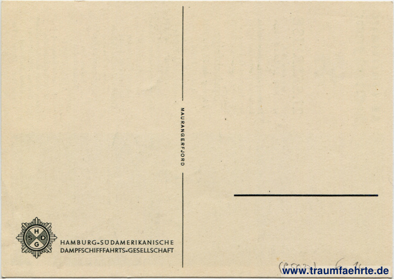 Beschriftung hinten: HSDG, Hamburg-Südamerikanische Dampfschifffahrts-Gesellschaft, Hardangerfjord