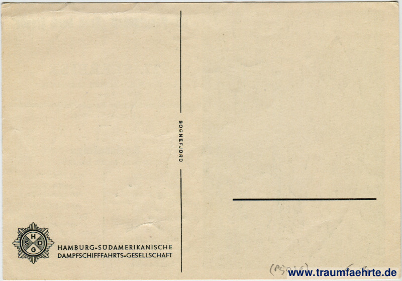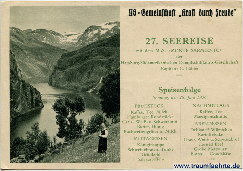 WARNING: Important Note on Works of National Socialism! – Details – Year: 1936 Postal state: postally unused Inscription front: NS-Gemeinschaft Kraft durch Freude, 27. Seereise mit dem M.-S. Monte Sarmiento der Hamburg-Südamerikanischen Dampfschifffahrts-Gesellschaft, Kapitän: C. Lübbe; Speisenfolge, Sonntag, den 28. Juni 1936; Frühstück: Kaffee, Tee, Milch, Hamburger Rundstücke, Grau-, Weiß- u. Schwarzbrot, Butter, Honig, Buchweizengrütze in Milch; Mittagessen: Königinsuppe, Schweinebraten, Tunke, Grünkohl, Salzkartoffeln; Nachmittags: Kaffee, Tee, Marzipanschnitte; Abendessen: Delikateß Würstchen, Kartoffelsalat, Grau-, Weiß- u. Schwarzbrot, Corned Beef, Grobe Mettwurst, Butter – Goudakäse, Tee Inscription back: HSDG, Hamburg-Südamerikanische Dampfschifffahrts-Gesellschaft, Sognefjord Postmark(s): none Please note: