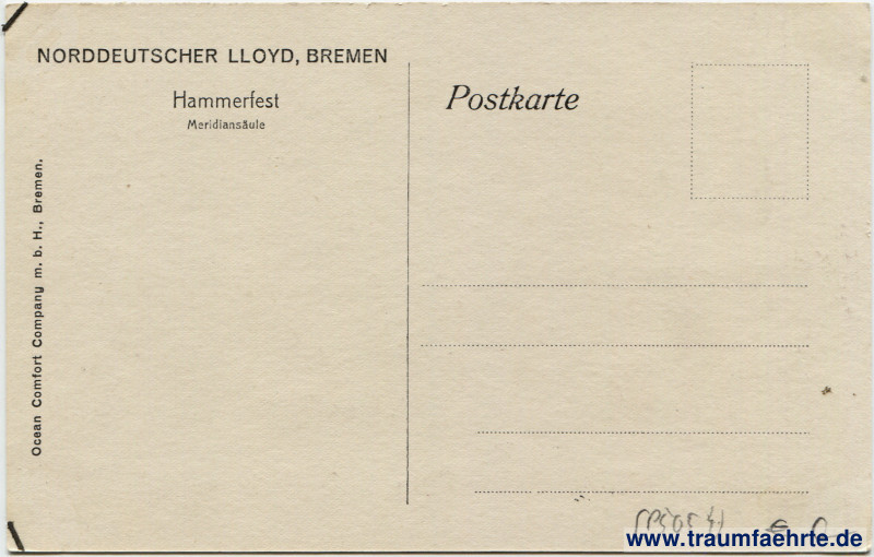 Beschriftung hinten: Postkarte, Norddeutscher Lloyd, Bremen, Hammerfest, Meridiansäule, Ocean Comfort Company m. b. H., Bremen.