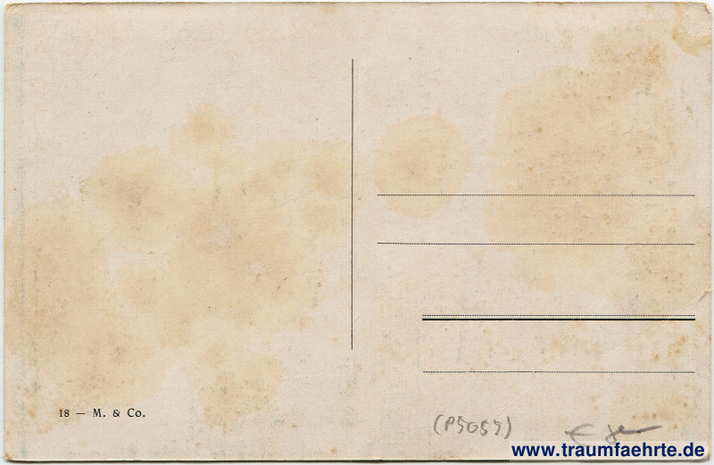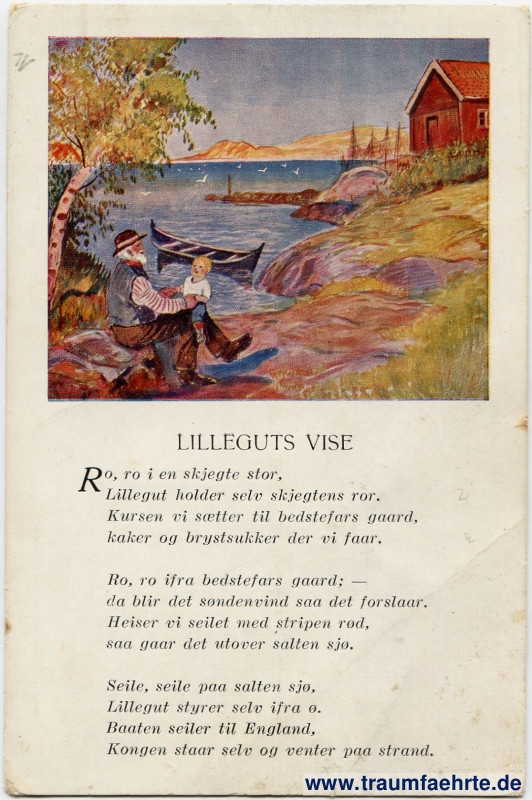 – Details – Jahr: ca. 1925 Status: ungelaufen Beschriftung vorne: Lilleguts Vise // Ro, ro i en skjegte stor, / Lillegut holder selv skjegtens ror. / Kursen vi sætter til bedstefars gaard, / kaker og brystsukker der vi faar. // Ro, ro ifra bedstefars gaard; – / da blir det sondenvind saa det forslaar. / Heiser vi seilet med stripen rød, / saa gaar det utover salten sjø. // Seile, seile paa salten sjø, / Lillegut styrer selv ifra ø. / Baaten seiler til England, / Kongen staar selv og venter paa strand. Beschriftung hinten: 18 – M. & Co. Stempel: keine Hinweis:
