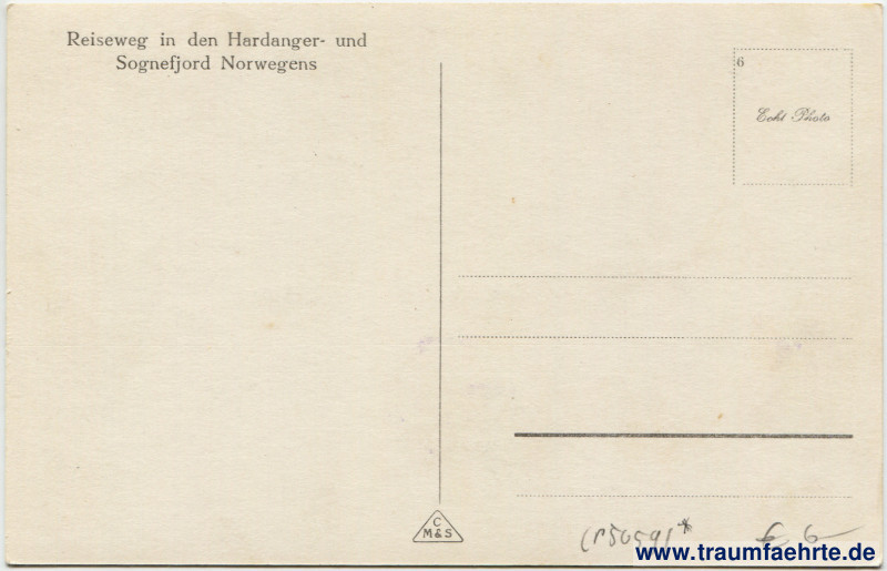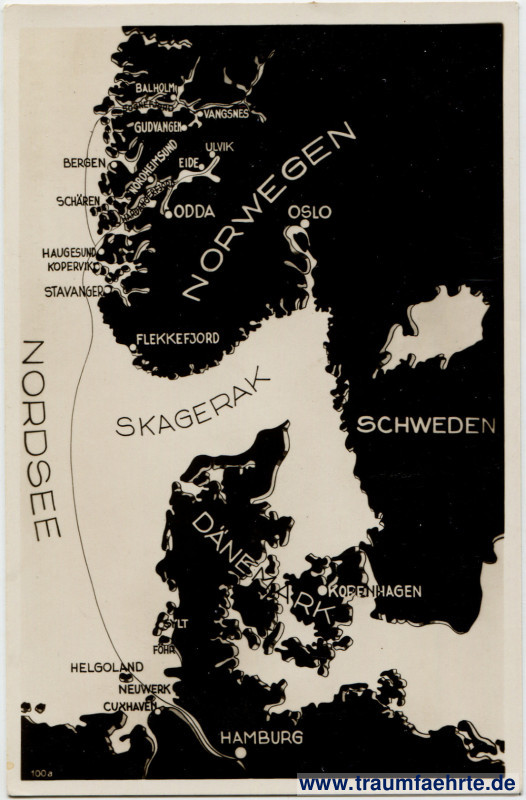 – Details – Jahr: ca. 1935 Status: ungelaufen Beschriftung vorne: 100 a, Nordsee, Skagerak, Norwegen, Schweden, Dänemark, Hamburg, Helgoland, Neuwerk, Cuxhaven, Föhr, Sylt, Kopenhagen, Oslo, Flekkefjord, Stavanger, Kopervik, Haugesund, Schären, Bergen, Odda, Hardangerfjord, Eide, Ulvik, Gudvangen, Vangsnes, Sognefjord, Balholm Beschriftung hinten: C M & S, Reiseweg in den Hardanger- und Sognefjord Norwegens, 6, Echt Photo Stempel: keine Hinweis: