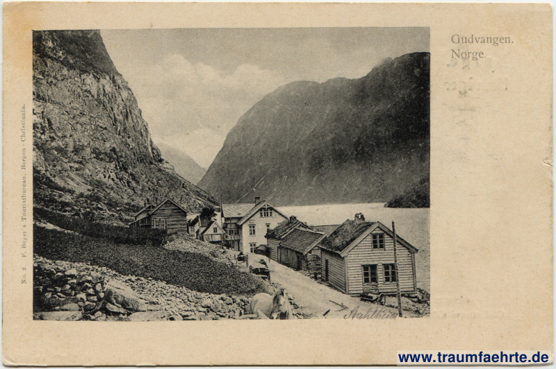 – Details – Jahr: ca. 1895 Status: ungelaufen Beschriftung vorne: Gudvangen. Norge. No. 2. F. Beyer's Touristbureau, Bergen - Christiania. Beschriftung hinten: Norge. Norvège. Brevkort. Carte postale. Verdenspostforeningen. Union postale universelle. Til … Pa denne side skrives kun adressen. Côté réservé à l'adresse. Stempel: keine Hinweis: