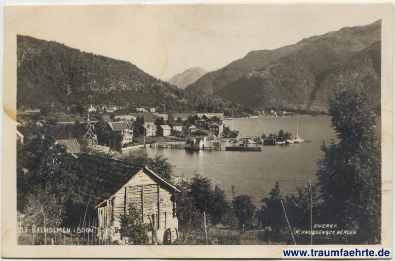 – Details – Year: ca. 1910 Postal state: postally unused Inscription front: […8]03. Balholmen i Sogn. Eneret. K. Knudsen & Co, Bergen Inscription back: Brevkort fra Norge, Atelier K. K., Bergen Postmark(s): none Please note: