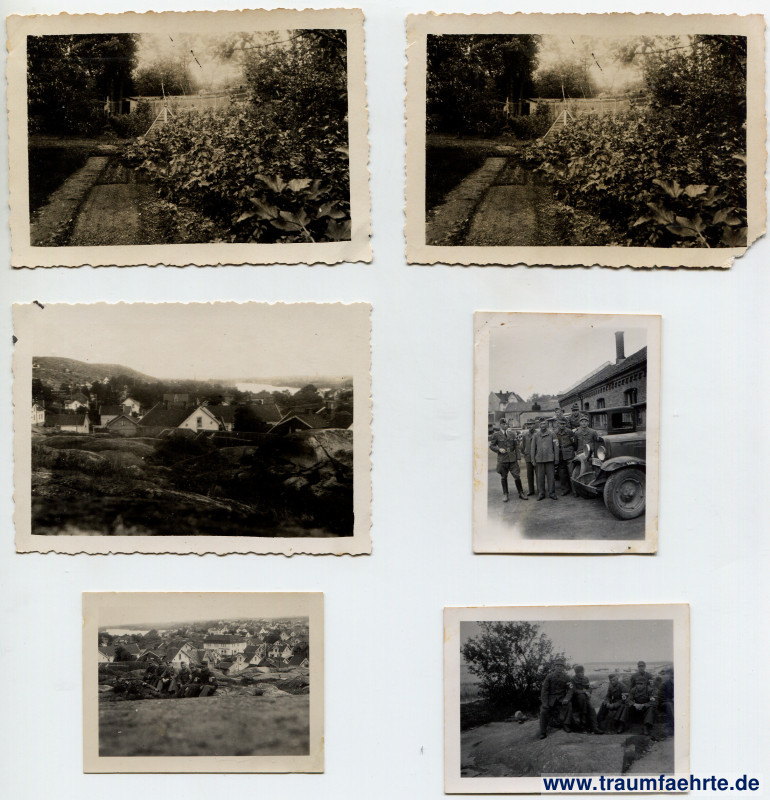 Schwarzweißfotografien mit sechs Ansichten – 1.) Gruppenfoto im Kleinformat (6,5x5cm) von uniformierten Nationalsozialisten am Strand, 2.) Gruppenfoto im Kleinformat (5x6,5cm) von uniformierten Nationalsozialisten mit Kraftfahrzeugen, 3.) Gruppenfoto im Kleinformat (6,5x5cm) von uniformierten Nationalsozialisten auf den Felsen, 4.) kleines Foto (ca. 9,5x7cm) mit Panorama eines norwegischen Ortes am Fluss oder Fjord, 5.)+6.) Foto einer Fuchsfarm