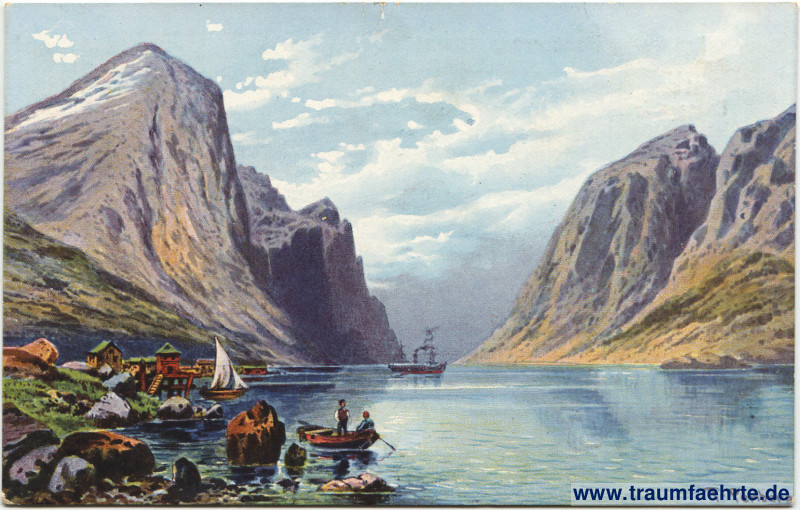 Schlagworte: Künstlerkarten, Fjorde, Atlantik, Schiffe, Boote, Dampfschiffe, Segelboote, Berge, Felsen, Schnee