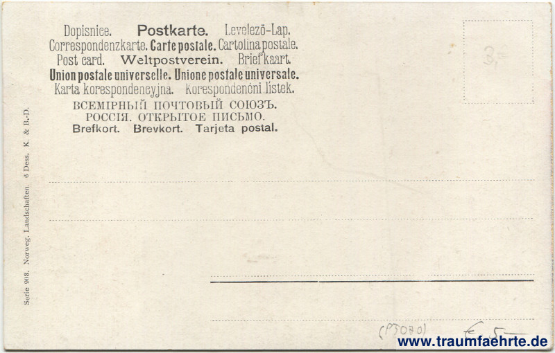 – Details – Jahr: ca. 1895 Status: ungelaufen Beschriftung vorne: T. Perlberg Beschriftung hinten: Dopisnice. Postkarte, Levelezö-Lap. Correspondenzkarte. Carte postale. Cartolina postale. Post card. Weltpostverein. Briefkaart. Union postale universelle. Union postale universale. Karta korespondencyjna. Korespondenóni lístek. Всемірный почтовый союзъ. Россія. Открытое письмо. Brefkort. Brevkort. Tarjeta postal. Serie 902. Norweg. Landschaften. 6 Dess. K. & B.-D. Stempel: keine Hinweis: