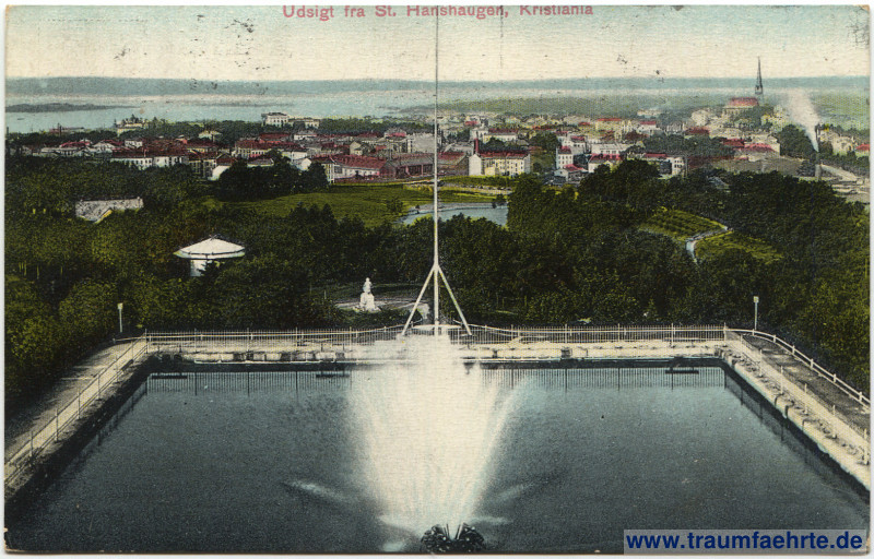 nachkolorierte Schwarzweißfotografie – Park mit Bassin, Springbrunnen, Bäumen, Pavillon, Laternen und Statue, Panorama von Oslo mit Häusern und Kirchtum sowie Oslofjord im Hintergrund