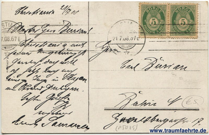 Stempel: 2x [Kri]stian[ia], 21.7.08.6–7 E; –––