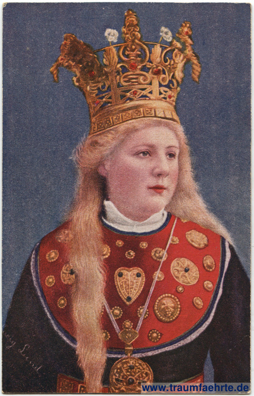 coloured artistic card – portrait of a blonde woman in Norwegian traditional clothing with crown, jewellry, and amulet