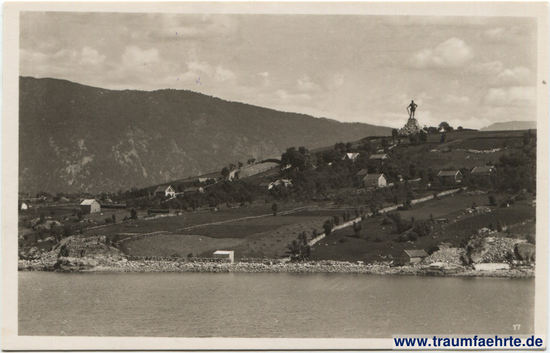 grey monochrome photograph – hill with statue (commisioned by German emperor Wilhelm II and presented to Norway, inaugurated in 1913 in presence of Wilhelm II and Norwegian king Haakon) and huts, Sogne fjord / Sognefjorden with stony shore, forested mountain in background