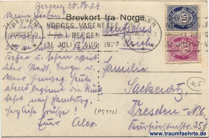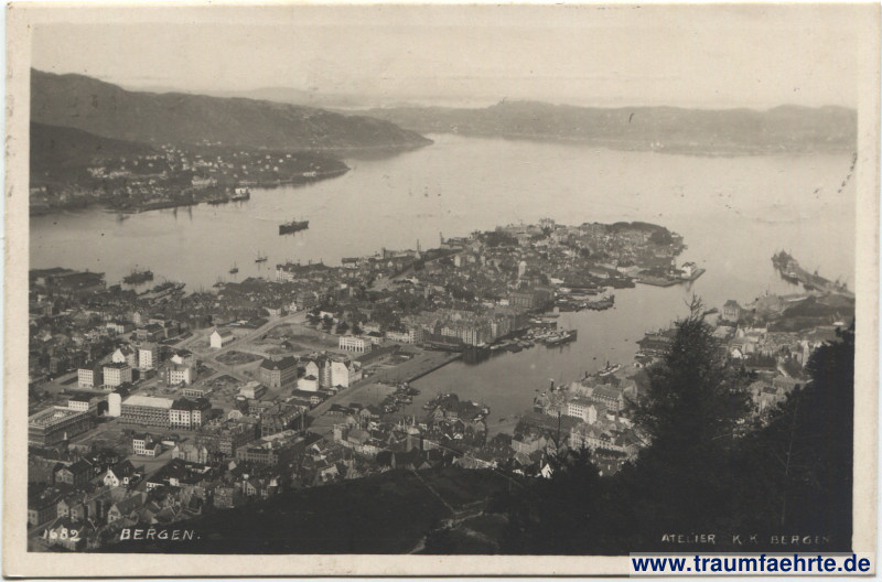 – Details – Jahr: ca. 1925 Status: gelaufen 1927 Beschriftung vorne: 1682 Bergen. Atelier K. K. Bergen Beschriftung hinten: Brevkort fra Norge, Atelier K. K. Bergen Stempel: 2x Bergen, * * *, 31.VII.27. 18–21; 2x Norges Varemesse i Bergen, 31 Juli–7 Aug 1927 Hinweis: