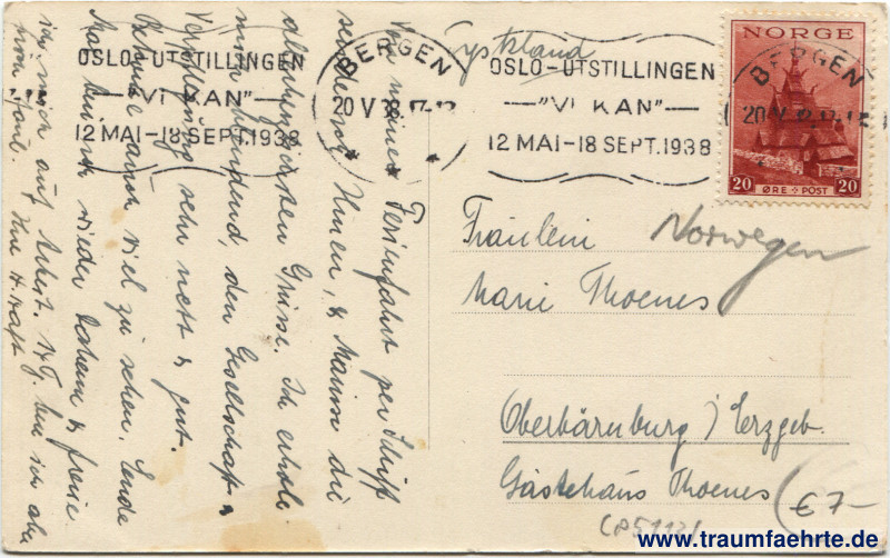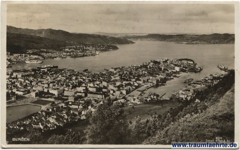 – Details – Jahr: ca. 1935 Status: gelaufen 1938 Beschriftung vorne: Bergen. 0399 Enerett Mittet & Co. Beschriftung hinten: kein Text Stempel: 2x Bergen, * * *, 20 V 38, 17–1[…]; 2x Oslo Utstillungen Vi Kan, 12 Mai – 18 Sept. 1938 Hinweis: