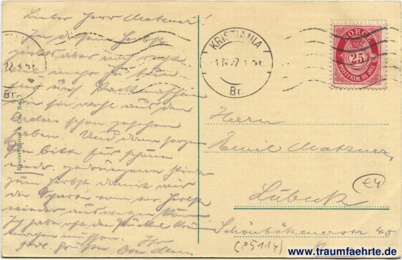 – Details – Jahr: ca. 1920 Status: gelaufen 1922 Beschriftung vorne: Bjórnsons og Ibsens Statuer ved Tivoli, Kristiania Beschriftung hinten: Eneret Mittet & Co, No. 1 Stempel: 2x Kristiania, Br., 1 IV 22 3–5[…]; ~~~ Hinweis: