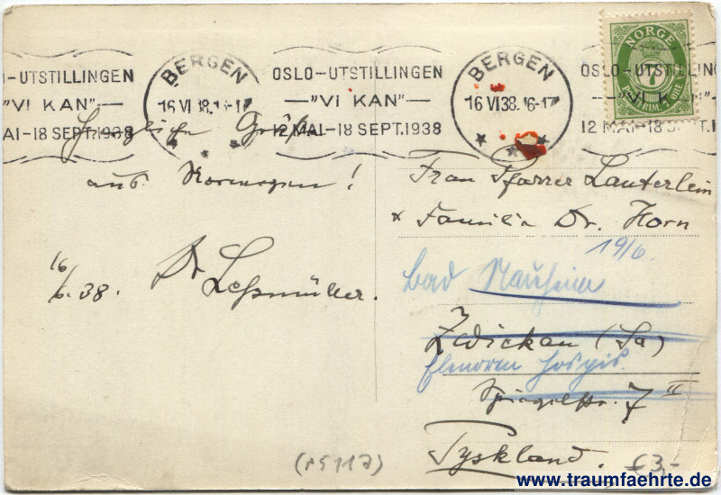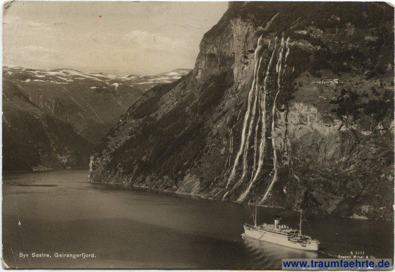 – Details – Jahr: ca. 1935 Status: gelaufen 1938 Beschriftung vorne: Syv Søstre, Geirangerfjord. S 3/117, Enerett Millet & Co. Beschriftung hinten: kein Text Stempel: 2x Bergen, ***, 16 VI 38. 16–17; 2x Oslo-Utstillingen, Vi Kan, 12 Mai – 18 Sept. 1938 Hinweis: