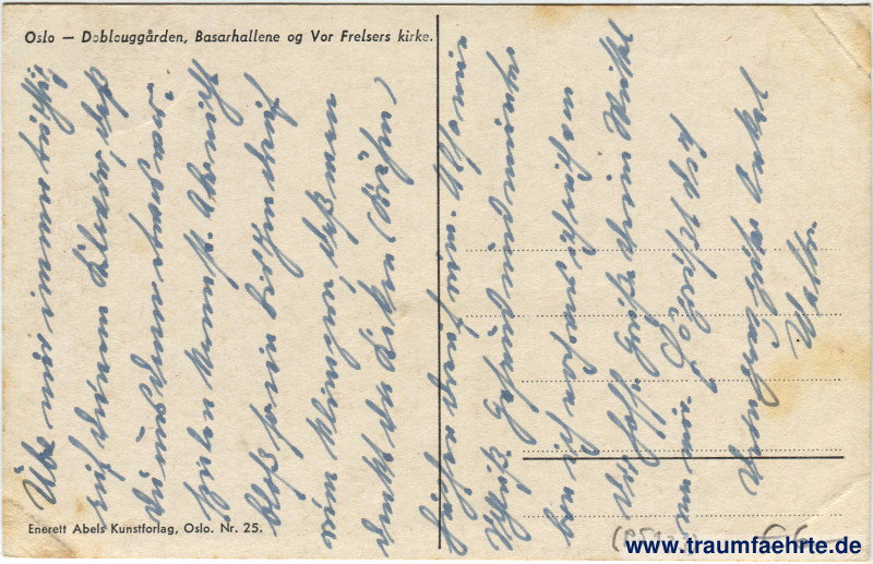Beschriftung hinten: Oslo – Doblouggården, Basarhallene og Vor Frelsers kirke. Enerett Abels Kunstforlag, Oslo. Nr. 25.