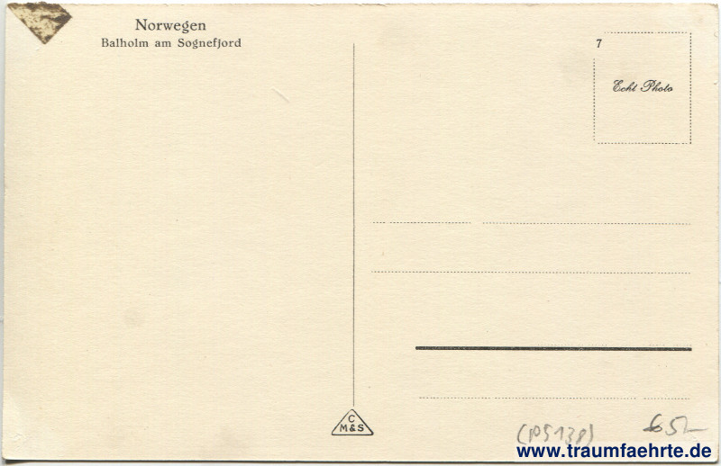 – Details – Year: ca. 1935 Postal state: postally unused Inscription front: 360 Inscription back: Norwegen, Balholm am Sognefjord, 7, Echt Photo, C M & S Postmark(s): none Please note: