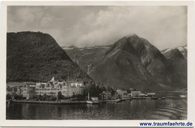grey monochrome photograph – Sogne Fjord / Sognefjorden with landing places and boats, shore with houses, column, poles, and hotel; mountains, forest, and snow in the background