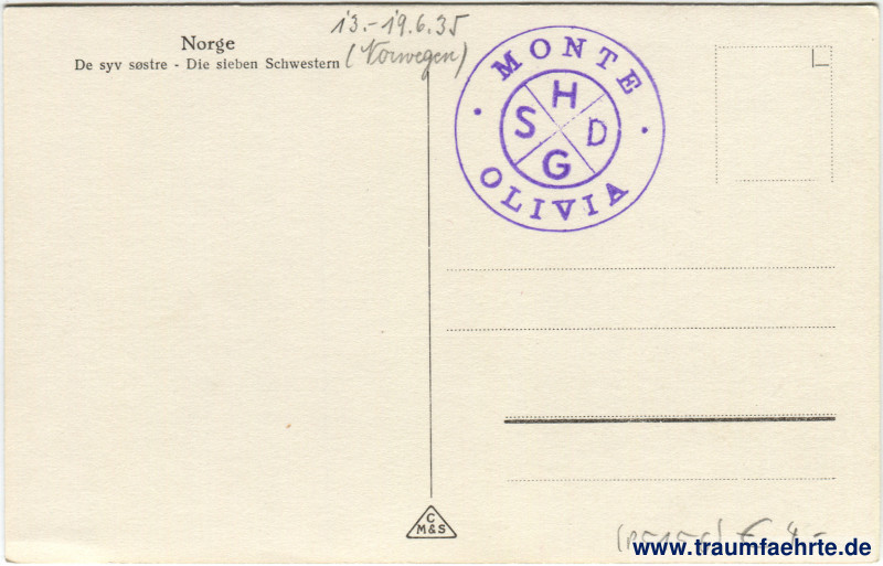 – Details – Year: ca. 1930 Postal state: postally not used 1935 Inscription front: 109 Inscription back: Norge, De syv søstre - Die sieben Schwestern, C M & S Postmark(s): Monte Olivia, HSGD Please note: