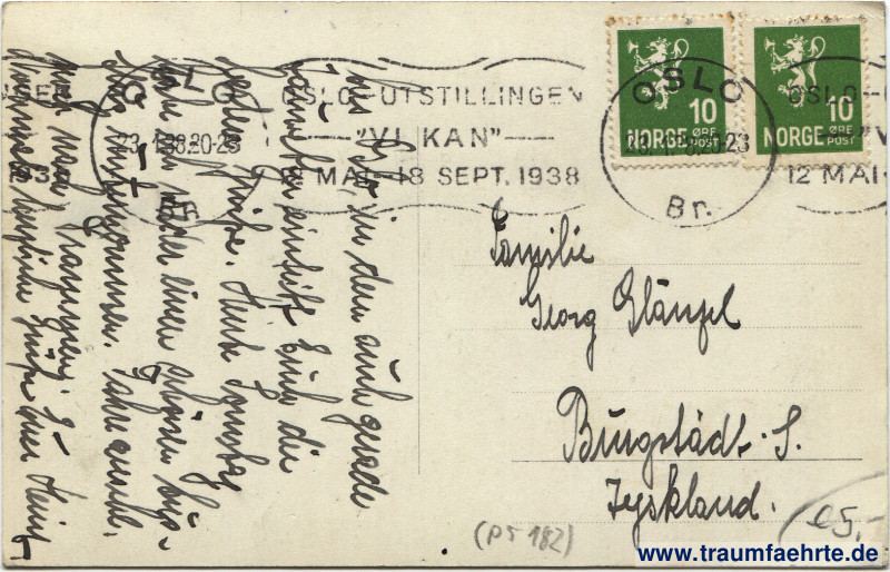 Stempel: 2x Oslo, 23 1 38 20–23; Oslo-Utstillingen, Vi Kan, 12 Mai – 18 Sept. 1938; Oslo – […], 12 Mai […]