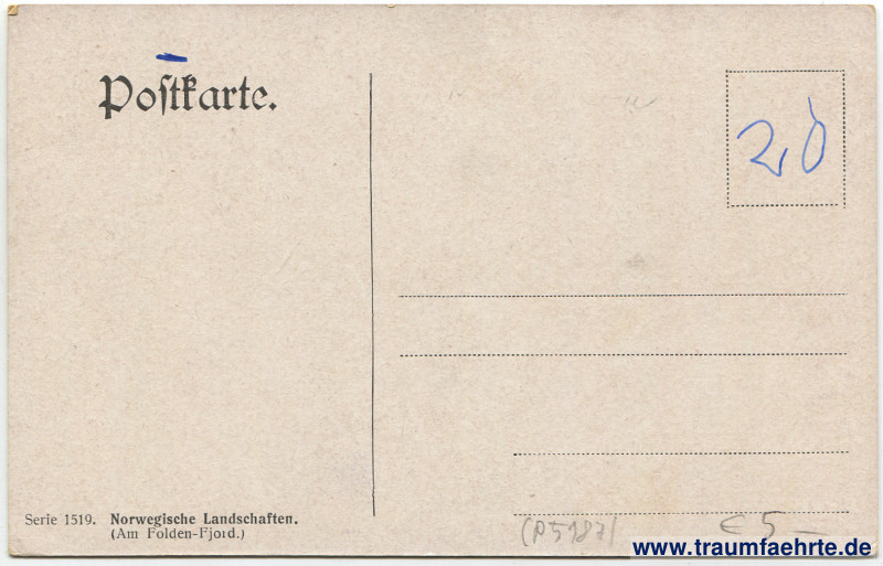 – Details – Jahr: ca. 1910 Status: ungelaufen Beschriftung vorne: Geo. M. Mz. Beschriftung hinten: Postkarte. Serie 1519. Norwegische Landschaften. (Am Folden-Fjord.) Stempel: keine Hinweis: