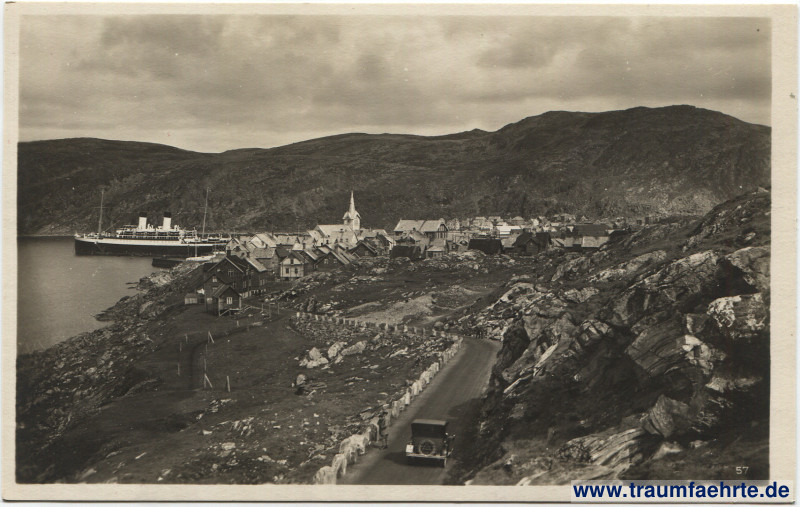 Schwarzweißfotografie – Fjord mit Dampfschiff, Straße mit Oldtimer, Stelen und Felsen, Panorama des Ortes mit Häusern und Kirche samt Kirchturm, die 1944 von den abrückenden Nazis zerstört wurde, Berge im Hintergrund