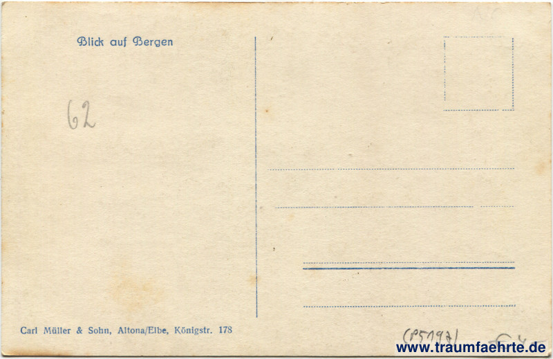 – Details – Jahr: ca. 1920 Status: ungelaufen Beschriftung vorne: 32 Beschriftung hinten: Blick auf Bergen, Carl & Müller & Sohn, Altona/Elbe, Königstr. 178 Stempel: keine Hinweis: