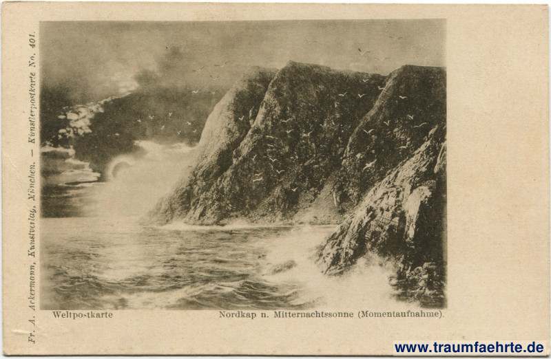 – Details – Jahr: ca. 1890 Status: ungelaufen Beschriftung vorne: Weltpostkarte, Nordkap n. Mitternachtssonne (Momentaufnahme). Fr. A. Ackermann, Kunstverlag, München. – Künstlerpostkarte No. 401. Beschriftung hinten: Postkarte. An … in … Stempel: keine Hinweis: