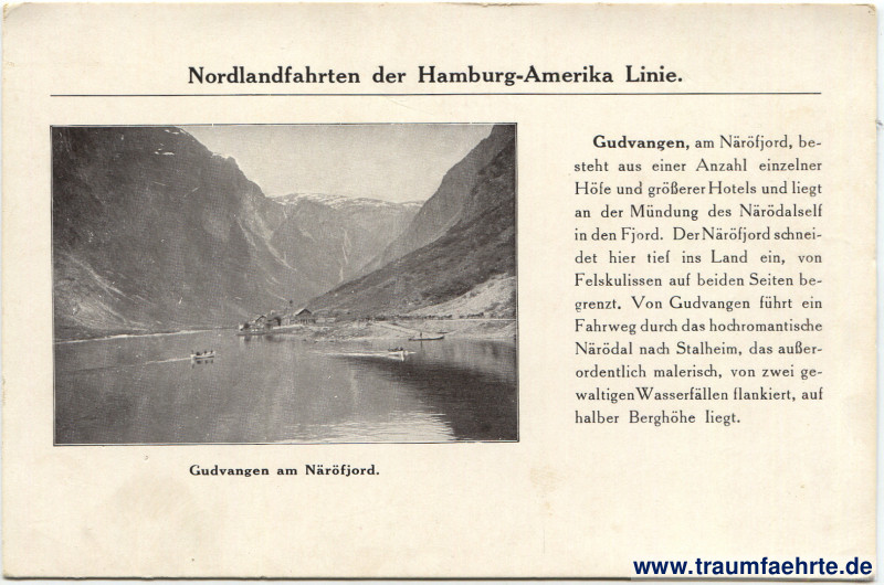 – Details – Year: ca. 1910 Postal state: postally unused Inscription front: Nordlandfahrten der Hamburg-Amerika Linie. Gudvangen am Näröfjord. Gudvangen, am Näröfjord, bestet aus einer Anzahl einzelner Höfe und größerer Hotels und liegt an der Mündung des Närödalself in den Fjord. Der Näröfjord schneidet hier tief in slAnd ein, von Felskulissen auf beiden Seiten begrenzt. Von Gudvangen führt ein Fahrweg durch das hochromantische Närödal nach Stalheim, das außerordentlich malerisch, von zwei gewaltigen Wasserfällen flankiert, auf halber Berghöhe liegt. Inscription back: Drucksache Postmark(s): none Please note: