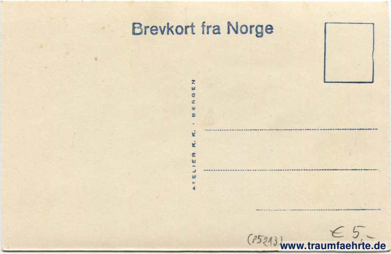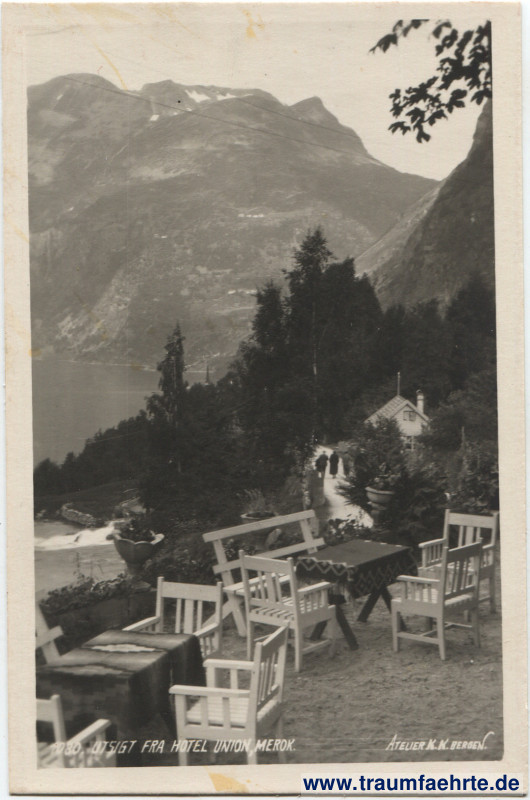 – Details – Jahr: ca. 1920 Status: ungelaufen Beschriftung vorne: 1080. Otsigt fra Hotel Union, Merok. Atelier K. K. Bergen. Beschriftung hinten: Brevkort fra Norge, Atelier K. K. · Bergen Stempel: keine Hinweis: