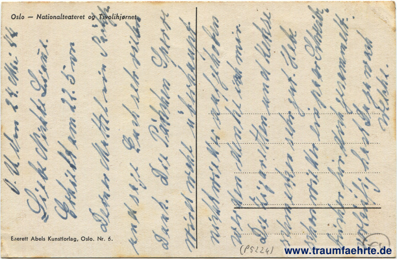 Beschriftung hinten: Oslo – Nationalteateret og Tivolihørnet. Enerett Abels Kunstforlag, Oslo. Nr. 6