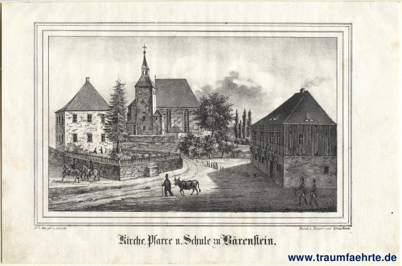 Original: Lithographie – Kirche Bärenstein, Pfarrhaus und Schule; Reiter, Mann mit Rind und Passanten im Vordergrund