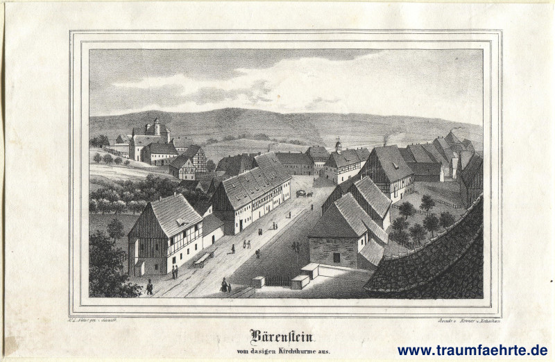 – Details – Jahr: ca. 1840 Beschriftung: Bärenstein vom dasigen Kirchthurme aus. N. d. Nat. gez. v. Schmidt. Steindr. v. Renner u. Krezschau. Hinweis: