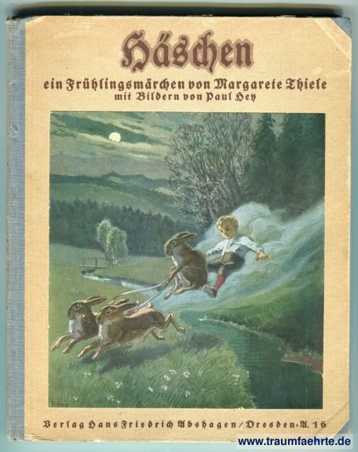 Alte Bücher etc. > Belletristik > Märchen & SagenThiele, Margarete: Häschen. Ein Frühlingsmärchen. [ Permalink ]>>> Artikel-Nr: 6595 <<< Dresden, Abshagen 1926, 1. Aufl., Deckelbild, 4 farbige Tafeln und weitere Textbilder von Paul Hey, 37 S., farb. illustr. OHLn., Groß-8° Zustand: Einband und Seiten etwas gebräunt, Widmung auf Vorsatz, Einbandkanten etwas berieben Preis: 95,00 €
