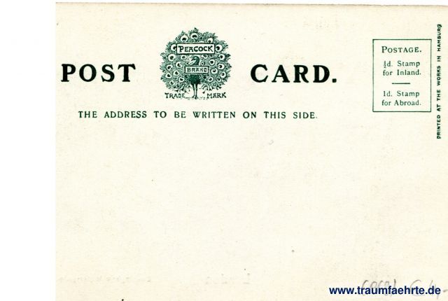 – Details – Year: vor 1945 Postal state: postally unused Inscription front: London, Buckingham Water-gate. Inscription back: Peacock Brand Trade Mark, Post Card. The address to be written on this side. Postage. ½d. Stamp for Inland. / 1d. Stamp for Abroad. Printed at the works in Hamburg Postmark(s): none Please note: