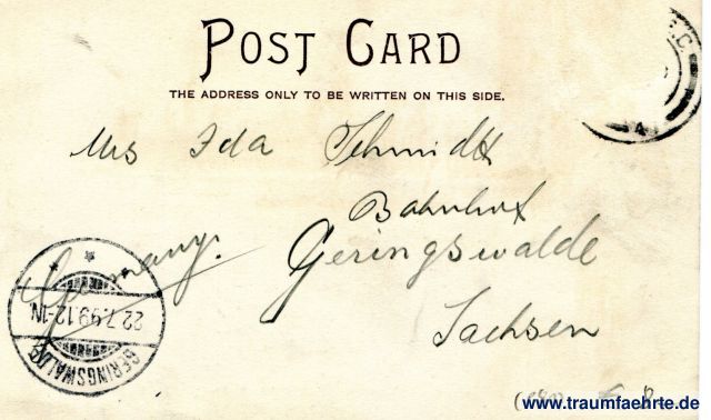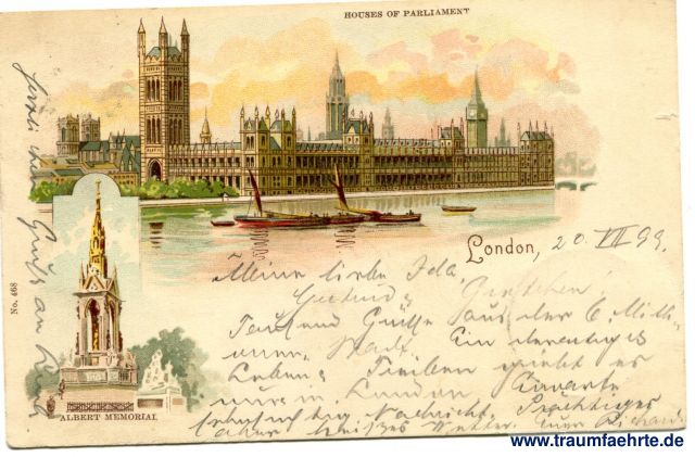– Details – Jahr: ca. 1895 Status: gelaufen 1899, Briefmarke entfernt Beschriftung vorne: London, Houses of Parliament, Albert Memorial, No. 468 Beschriftung hinten: Post Card, the address only to be written on this side. Stempel: (... E.C.); Geringswalde, 22.7.99.12-1N. Hinweis: